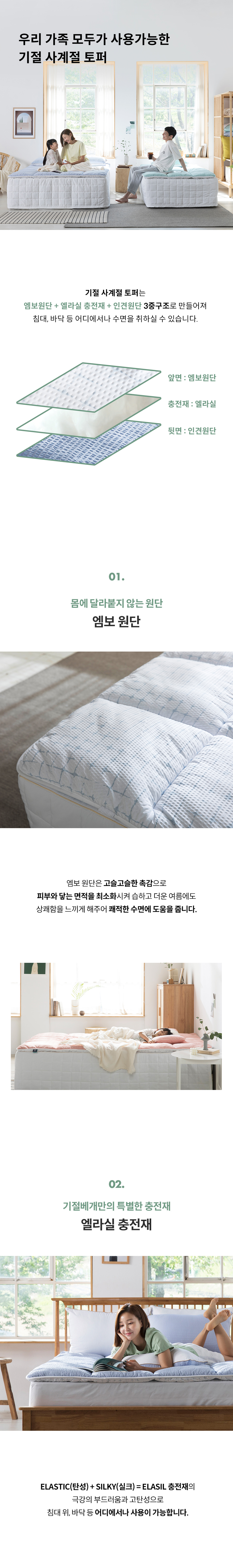 | 제품 소재 | 앞면 - 레이온 40%+폴리에스터 60% (기절 인견원단) 뒷면 - 폴리에스터 100% (에어라이트 프로텍터 원단) 충전재 - 폴리에스터 100% (엘라실) |